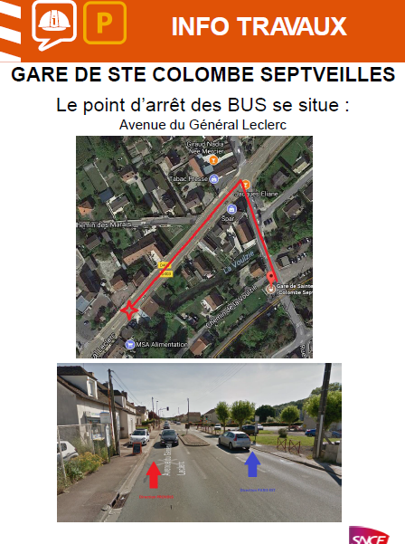 • Le Point d’Arrêt des BUS à STE COLOMBE est délocalisé. Les bus ne peuvent pas desservir la gare car il n’y aucune possibilité de faire demi-tour dans la rue Victor Hugo. Le point d’arrêt se situe Avenue du Géneral Leclerc.